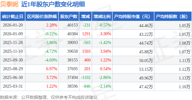 从股价来看,2026年1月9日至2026年1月20日,贝泰妮区间涨幅为2.28%,在此期间股东户数减少231.0户,减幅为0.57%。