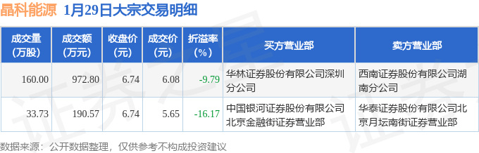 证券之星消息,1月29日晶科能源发生大宗交易,交易数据如下: