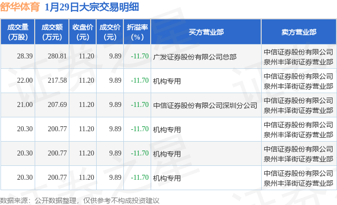 证券之星消息,1月29日舒华体育发生大宗交易,交易数据如下: