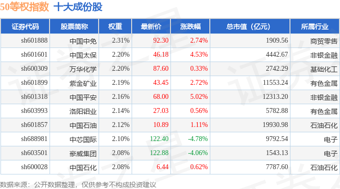 证券之星消息,1月29日,50等权(000050)指数报收于2479.04点,涨0.7%,成交2948.88亿元,换手率0.6%。当日该指数成份股中,上涨的有35家,山西汾酒以10.0%的涨幅领涨,下跌的有14家,澜起科技以6.39%的跌幅领跌。