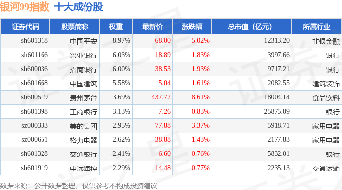 证券之星消息,1月29日,银河99(000959)指数报收于8144.3点,涨2.05%,成交4990.04亿元,换手率0.94%。当日该指数成份股中,上涨的有65家,山西汾酒以10.0%的涨幅领涨,下跌的有33家,澜起科技以6.39%的跌幅领跌。