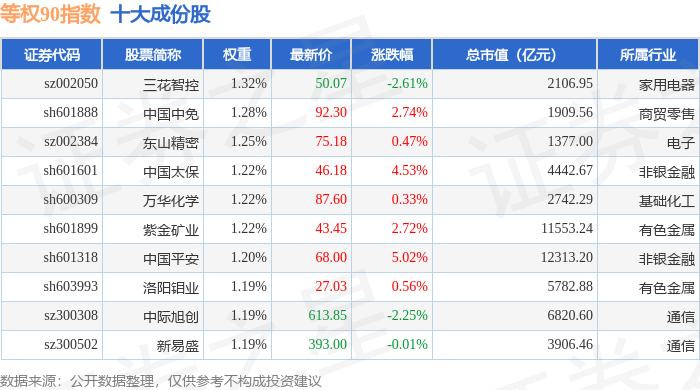 等权90(000971)指数十大成份股详情如下: