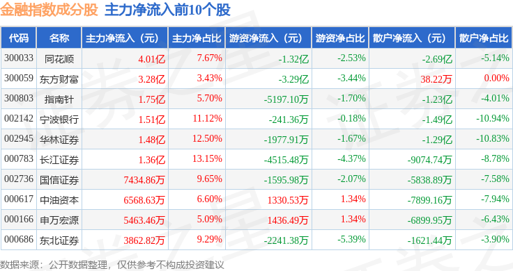 资金流向方面,金融指数(399240)成份股当日主力资金净流入合计16.51亿元,游资资金净流出合计6.57亿元,散户资金净流出合计9.94亿元。成份股资金流向详情见下表: