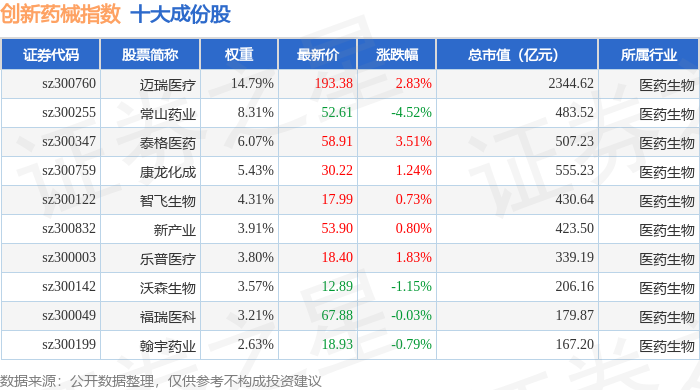 创新药械(399265)指数十大成份股详情如下: