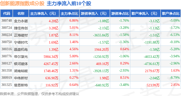 资金流向方面,创新能源(399266)指数成份股当日主力资金净流出合计50.07亿元,游资资金净流入合计9.55亿元,散户资金净流入合计40.52亿元。成份股资金流向详情见下表:
