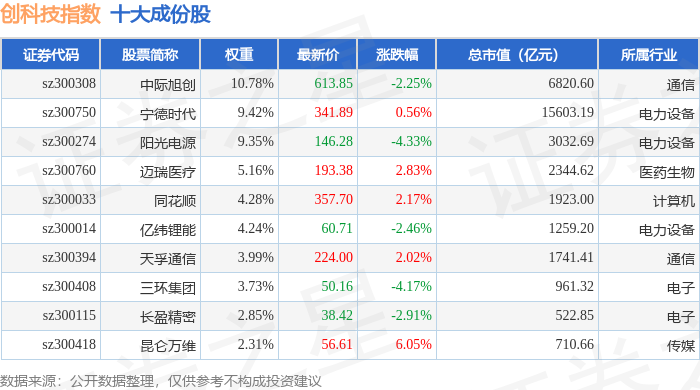 创科技(399276)指数十大成份股详情如下: