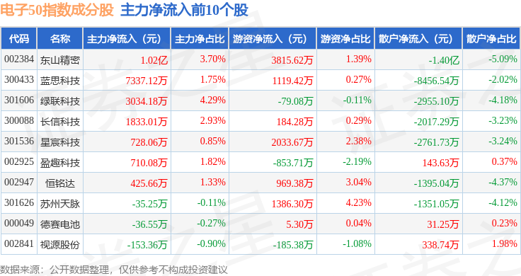资金流向方面,电子50(399281)指数成份股当日主力资金净流出合计73.52亿元,游资资金净流入合计15.13亿元,散户资金净流入合计58.39亿元。成份股资金流向详情见下表: