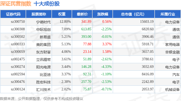深证民营(399337)指数十大成份股详情如下: