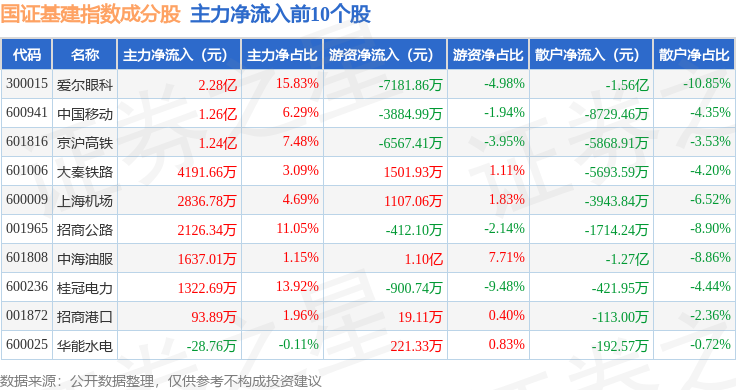 资金流向方面,国证基建(399359)指数成份股当日主力资金净流出合计37.12亿元,游资资金净流入合计18.69亿元,散户资金净流入合计18.44亿元。成份股资金流向详情见下表: