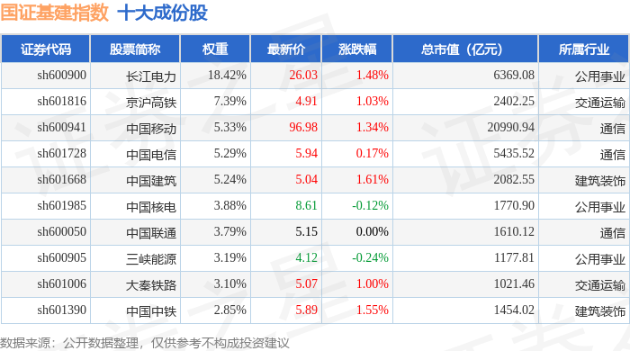 证券之星消息,1月29日,国证基建(399359)指数报收于2594.45点,涨0.68%,成交576.79亿元,换手率1.27%。当日该指数成份股中,上涨的有27家,爱尔眼科以3.45%的涨幅领涨,下跌的有19家,锐捷网络以4.98%的跌幅领跌。