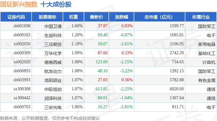 证券之星消息,1月29日,国证新兴(399392)指数报收于3122.2点,跌0.7%,成交4265.84亿元,换手率1.8%。当日该指数成份股中,上涨的有40家,片仔癀以6.85%的涨幅领涨,下跌的有58家,生益科技以6.87%的跌幅领跌。