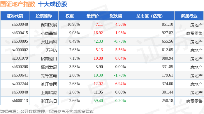 国证地产(399393)指数十大成份股详情如下: