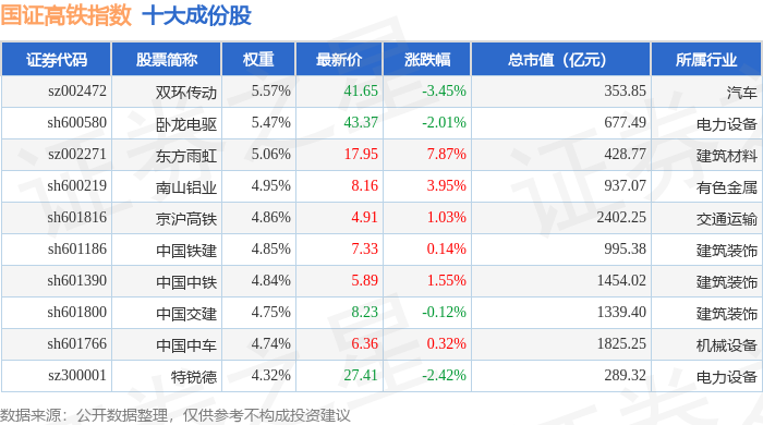 证券之星消息,1月29日,国证高铁(399419)指数报收于2270.17点,跌0.29%,成交357.38亿元,换手率2.32%。当日该指数成份股中,上涨的有12家,东方雨虹以7.87%的涨幅领涨,下跌的有38家,今创集团以9.96%的跌幅领跌。