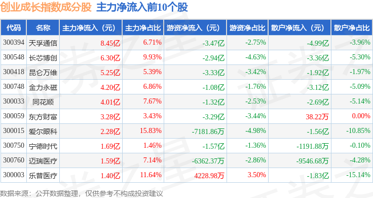 资金流向方面,创业成长(399667)指数成份股当日主力资金净流出合计33.08亿元,游资资金净流出合计6.86亿元,散户资金净流入合计39.94亿元。成份股资金流向详情见下表: