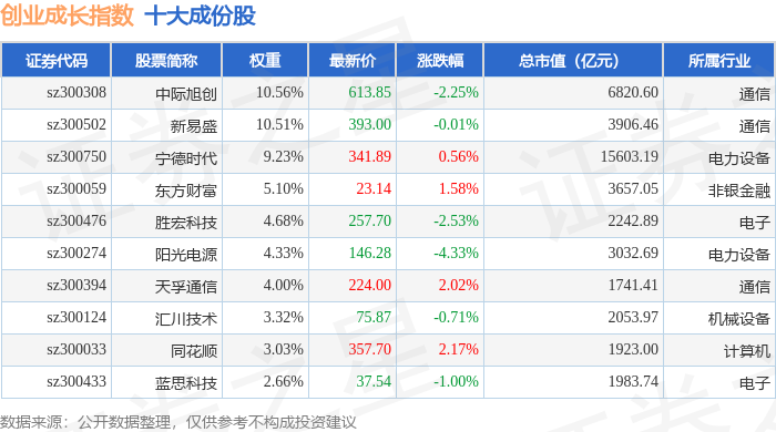 创业成长(399667)指数十大成份股详情如下: