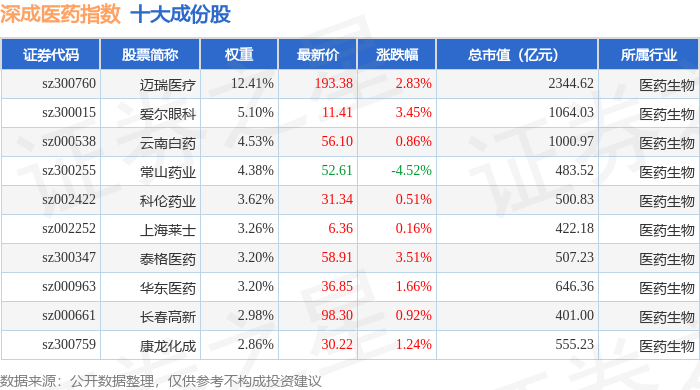深成医药(399685)指数十大成份股详情如下:
