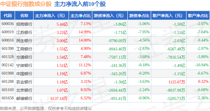 资金流向方面,中证银行(399986)指数成份股当日主力资金净流入合计14.89亿元,游资资金净流出合计7.67亿元,散户资金净流出合计7.22亿元。成份股资金流向详情见下表: