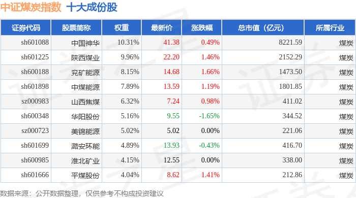 证券之星消息,1月29日,中证煤炭(399998)指数报收于2161.99点,涨0.7%,成交182.23亿元,换手率2.1%。当日该指数成份股中,上涨的有22家,山西焦化以7.95%的涨幅领涨,下跌的有6家,大有能源以4.12%的跌幅领跌。