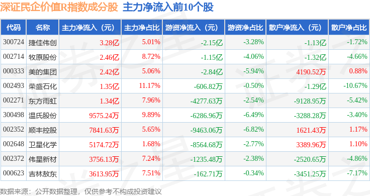 资金流向方面,深证民企价值R(470072)指数成份股当日主力资金净流入合计4.19亿元,游资资金净流出合计6.9亿元,散户资金净流入合计2.71亿元。成份股资金流向详情见下表: