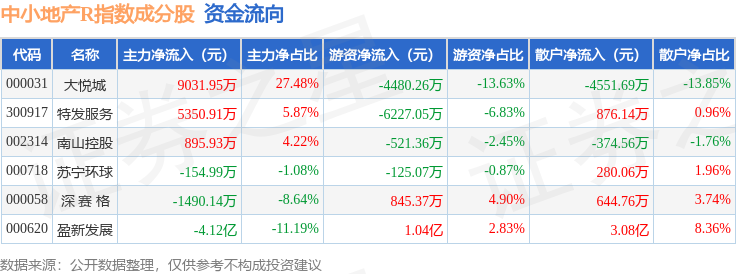 资金流向方面,中小地产R(471002)指数成份股当日主力资金净流出合计2.76亿元,游资资金净流出合计72.35万元,散户资金净流入合计2.77亿元。成份股资金流向详情见下表: