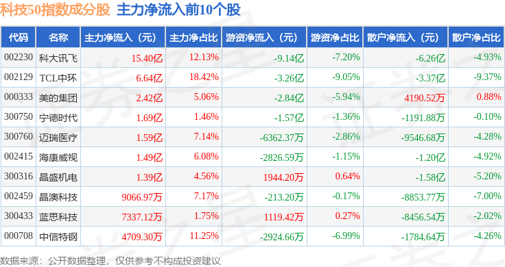 资金流向方面,科技50(970080)指数成份股当日主力资金净流出合计101.15亿元,游资资金净流入合计11.56亿元,散户资金净流入合计89.59亿元。成份股资金流向详情见下表: