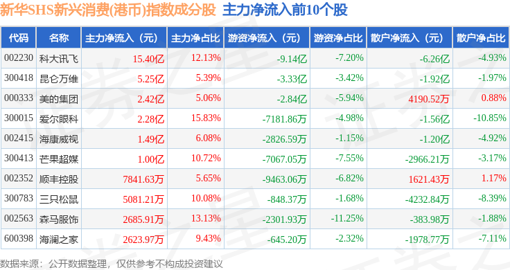 资金流向方面,新华SHS新兴消费(港币)(989007)指数成份股当日主力资金净流入合计18.67亿元,游资资金净流出合计16.94亿元,散户资金净流出合计1.73亿元。成份股资金流向详情见下表: