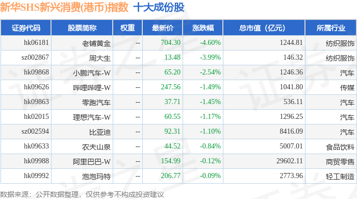 新华SHS新兴消费(港币)(989007)指数十大成份股详情如下: