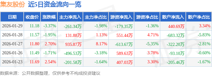 证券之星消息,截至2026年1月29日收盘,集友股份(603429)报收于11.18元,下跌3.37%,换手率2.23%,成交量11.69万手,成交额1.32亿元。