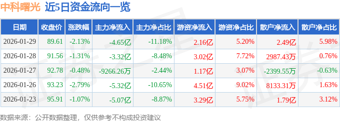 证券之星消息,截至2026年1月29日收盘,中科曙光(603019)报收于89.61元,下跌2.13%,换手率3.14%,成交量45.93万手,成交额41.59亿元。