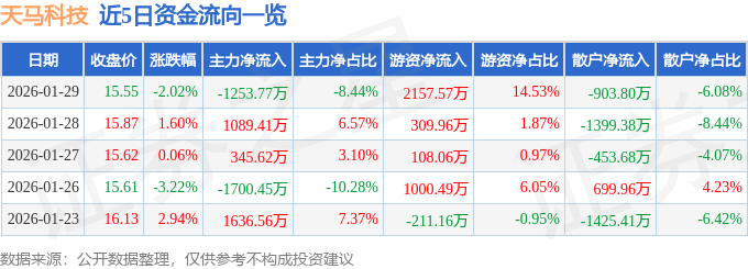 证券之星消息,截至2026年1月29日收盘,天马科技(603668)报收于15.55元,下跌2.02%,换手率1.89%,成交量9.56万手,成交额1.49亿元。