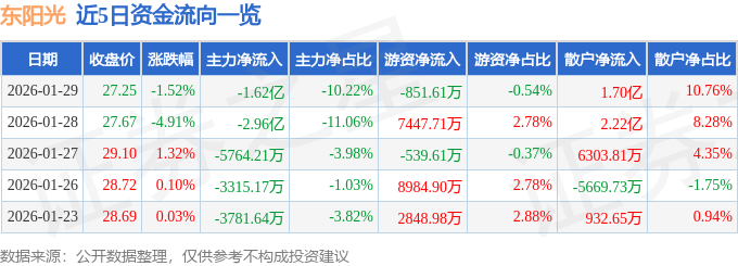 证券之星消息,截至2026年1月29日收盘,东阳光(600673)报收于27.25元,下跌1.52%,换手率1.9%,成交量57.16万手,成交额15.82亿元。