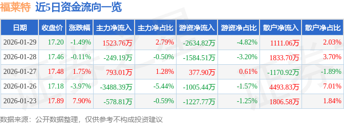 证券之星消息,截至2026年1月29日收盘,福莱特(601865)报收于17.2元,下跌1.49%,换手率1.66%,成交量31.53万手,成交额5.47亿元。
