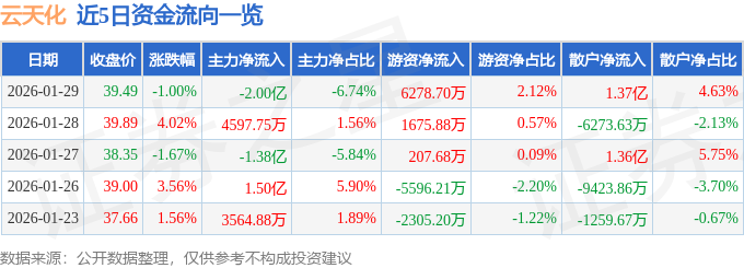 证券之星消息,截至2026年1月29日收盘,云天化(600096)报收于39.49元,下跌1.0%,换手率4.08%,成交量74.41万手,成交额29.63亿元。