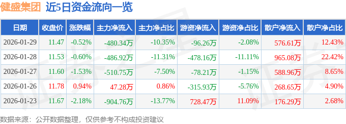 证券之星消息,截至2026年1月29日收盘,健盛集团(603558)报收于11.47元,下跌0.52%,换手率1.18%,成交量4.03万手,成交额4639.07万元。