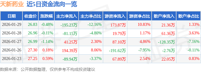 证券之星消息,截至2026年1月29日收盘,天新药业(603235)报收于26.83元,下跌0.48%,换手率0.14%,成交量5977.0手,成交额1605.07万元。