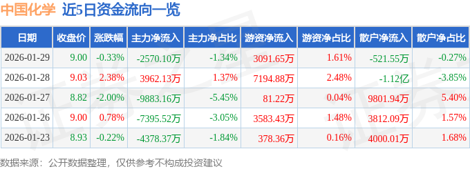 证券之星消息,截至2026年1月29日收盘,中国化学(601117)报收于9.0元,下跌0.33%,换手率3.5%,成交量213.03万手,成交额19.15亿元。