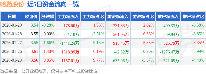 证券之星消息,截至2026年1月29日收盘,哈药股份(600664)报收于3.54元,下跌0.28%,换手率1.29%,成交量32.4万手,成交额1.14亿元。