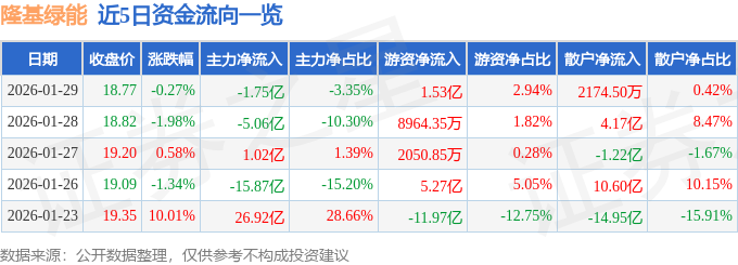 证券之星消息,截至2026年1月29日收盘,隆基绿能(601012)报收于18.77元,下跌0.27%,换手率3.63%,成交量275.46万手,成交额52.11亿元。