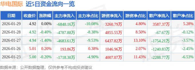 证券之星消息,截至2026年1月29日收盘,华电国际(600027)报收于4.92元,上涨0.0%,换手率1.64%,成交量139.35万手,成交额6.79亿元。