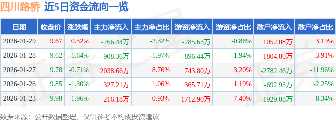 证券之星消息,截至2026年1月29日收盘,四川路桥(600039)报收于9.67元,上涨0.52%,换手率0.4%,成交量34.4万手,成交额3.3亿元。