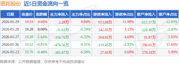 证券之星消息,截至2026年1月29日收盘,诺邦股份(603238)报收于19.33元,上涨0.68%,换手率1.48%,成交量2.63万手,成交额5117.29万元。
