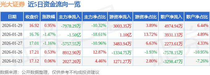 证券之星消息,截至2026年1月29日收盘,光大证券(601788)报收于16.92元,上涨0.95%,换手率1.18%,成交量46.28万手,成交额7.73亿元。