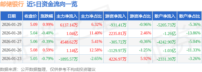 证券之星消息,截至2026年1月29日收盘,邮储银行(601658)报收于5.09元,上涨0.99%,换手率0.29%,成交量192.19万手,成交额9.71亿元。