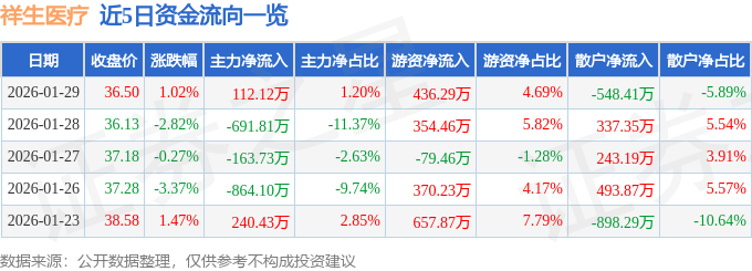 证券之星消息,截至2026年1月29日收盘,祥生医疗(688358)报收于36.5元,上涨1.02%,换手率2.25%,成交量2.52万手,成交额9310.82万元。