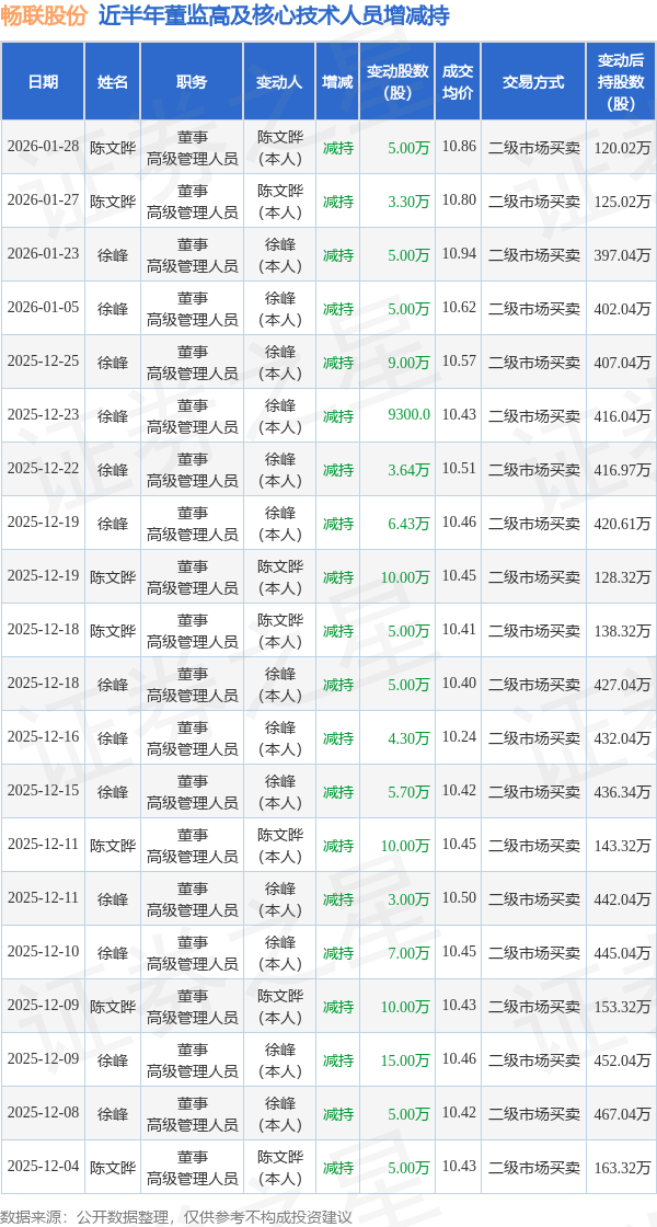畅联股份近半年内的董监高及核心技术人员增减持详情如下: