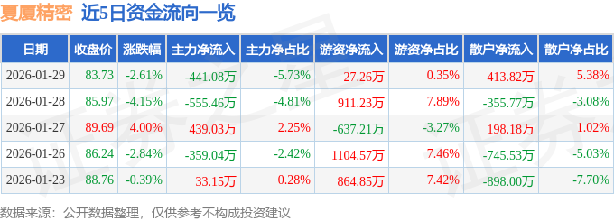证券之星消息,截至2026年1月29日收盘,夏厦精密(001306)报收于83.73元,下跌2.61%,换手率5.84%,成交量9057.0手,成交额7691.4万元。