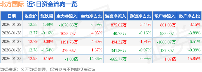 证券之星消息,截至2026年1月29日收盘,北方国际(000065)报收于12.58元,下跌1.49%,换手率2.06%,成交量20.05万手,成交额2.54亿元。