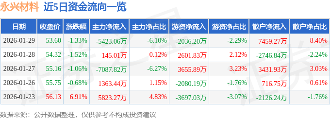 证券之星消息,截至2026年1月29日收盘,永兴材料(002756)报收于53.6元,下跌1.33%,换手率4.23%,成交量16.45万手,成交额8.88亿元。