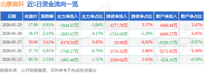 证券之星消息,截至2026年1月29日收盘,北摩高科(002985)报收于37.88元,下跌0.81%,换手率10.02%,成交量17.59万手,成交额6.76亿元。