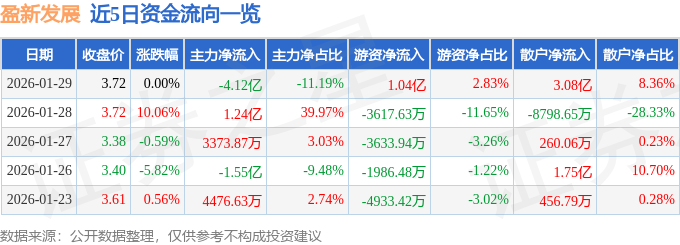 证券之星消息,截至2026年1月29日收盘,盈新发展(000620)报收于3.72元,上涨0.0%,换手率20.42%,成交量954.17万手,成交额36.83亿元。